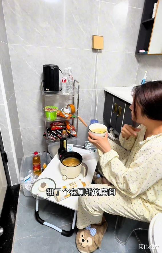 为了方便生活,女子买了个电煮锅,平时就在厕所里边煮面吃, 有时面煮多了女子还留着下顿继续吃。