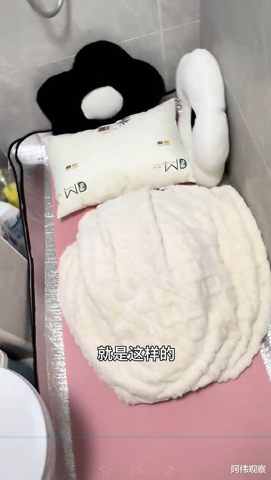 晚上睡觉时,女子则是用塑料的隔热垫在马桶旁边一铺,正好可以容纳一个人躺下,不过晚上想要翻身,还是显得有些困难。